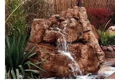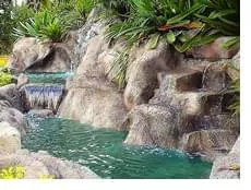As cascatas para piscinas já têm hidráulica embutida na pedra e percurso de água pré projetado, evitando vazamentos. São encontradas em alvenaria, vinil ou fibra, independente do tipo de piscina ou formato. As cores das pedras são adaptáveis aos tons dos decks de pedras (Madera, Goiás, São Tomé, etc) ou rochas da região (granito cinza, granito rosa, moledo, etc).